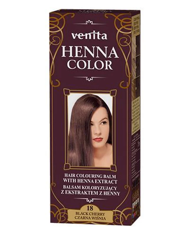 VENITA Henna Color Balsam Koloryzujący nr 18 Czarna Wiśnia to produkt kosmetyczny. Przeznaczony do pielęgnacji i koloryzacji włosów. Formuła wzbogacona o naturalne składniki, które odżywiają i regenerują włosy. Balsam intensywnie koloryzuje, nadając głęboki odcień czarnej wiśni. Produkt jest prosty w aplikacji i pozwala osiągnąć efekt podobny do tradycyjnej henny, przy jednoczesnym nawilżaniu włosów. Idealny do stosowania pomiędzy farbowaniami lub jako metoda koloryzacji.Składniki/Ingredients