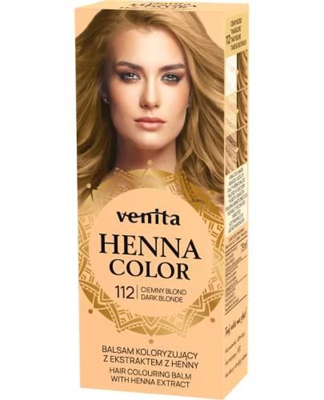 Venita Henna Color, balsam koloryzujący z ekstraktem z henny, 112 Ciemny Blond - produkt kosmetyczny opracowany z myślą o osobach, którym zależy na zdrowych, lśniących włosach. Zapewnia trwałość koloru do ok. 8 myć.Składniki/Ingredients
