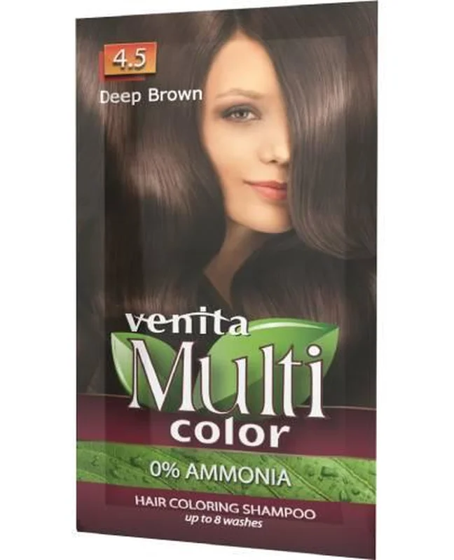 Venita Multi Color, szampon koloryzujący, 4.5 Głęboki Brąz - produkt kosmetyczny do koloryzacji włosów. Zapewnia trwałość koloru nawet do 8 myć. Bez amoniaku.Składniki/Ingredients