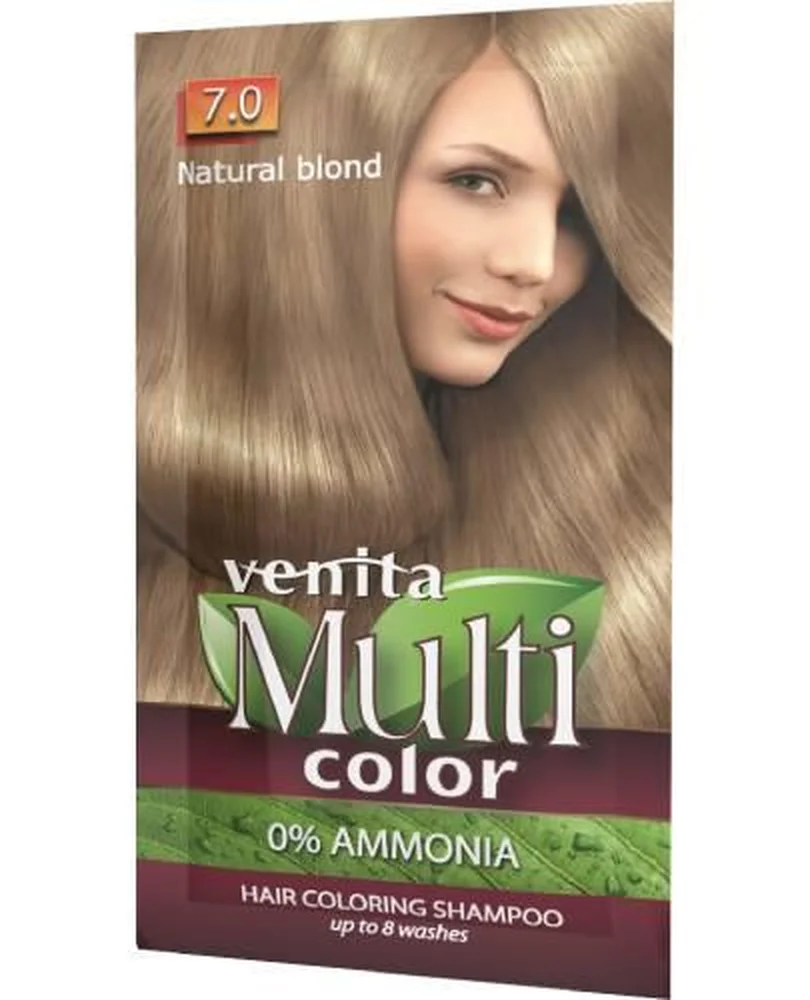 Venita Multi Color, szampon koloryzujący, 7.0 Naturalny Blond - produkt kosmetyczny w saszetce, zapewnia naturalny efekt koloryzacji, jednocześnie pielęgnuje i odżywia włosy.Składniki/Ingredients