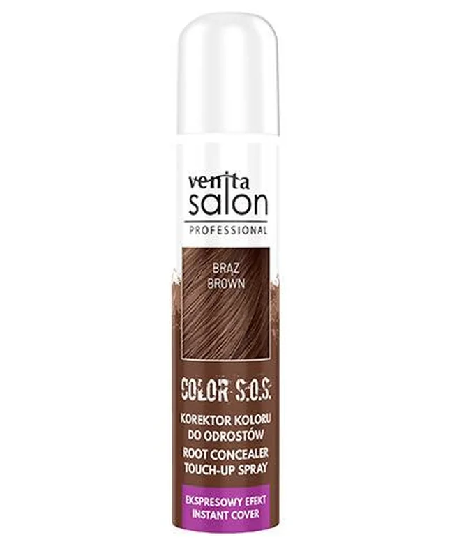 Venita Salon Professional Color S.O.S, korektor koloru spray do odrostów do włosów brązowych i siwych - produkt kosmetyczny zapewniający szybkie odświeżenie koloru. Retuszuje jaśniejsze i siwe odrosty.Składniki/Ingredients