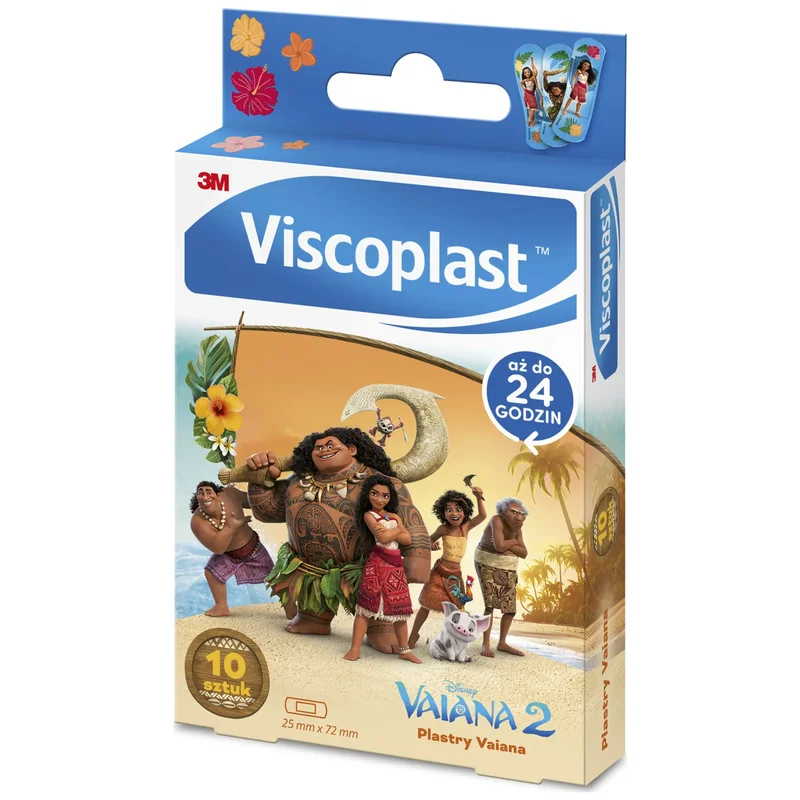 Viscoplast, Plastry Vaiana to wyrób medyczny. Plastry mają wymiary 72 mm x 25 mm i przeznaczone są do zabezpieczania ran i otarć. Charakteryzują się adhezyjną warstwą, która zapewnia trwałe przyleganie do skóry. Produkt jest odporny na wodę, co wspomaga ochronę rany w codziennych sytuacjach. W opakowaniu znajduje się 10 sztuk plastrów. Produkt przeznaczony dla osób dorosłych oraz dzieci.