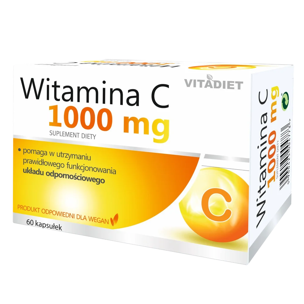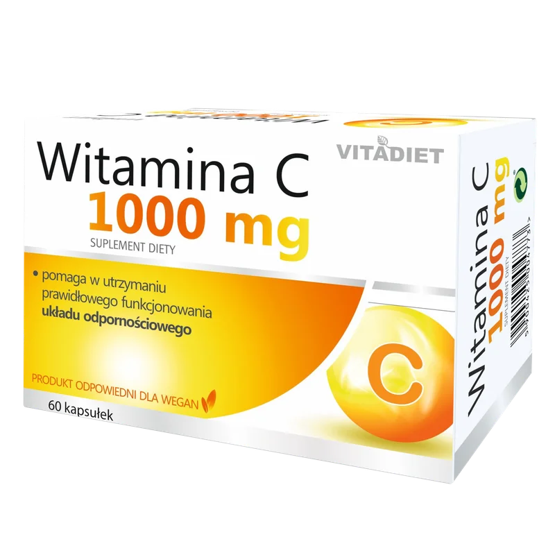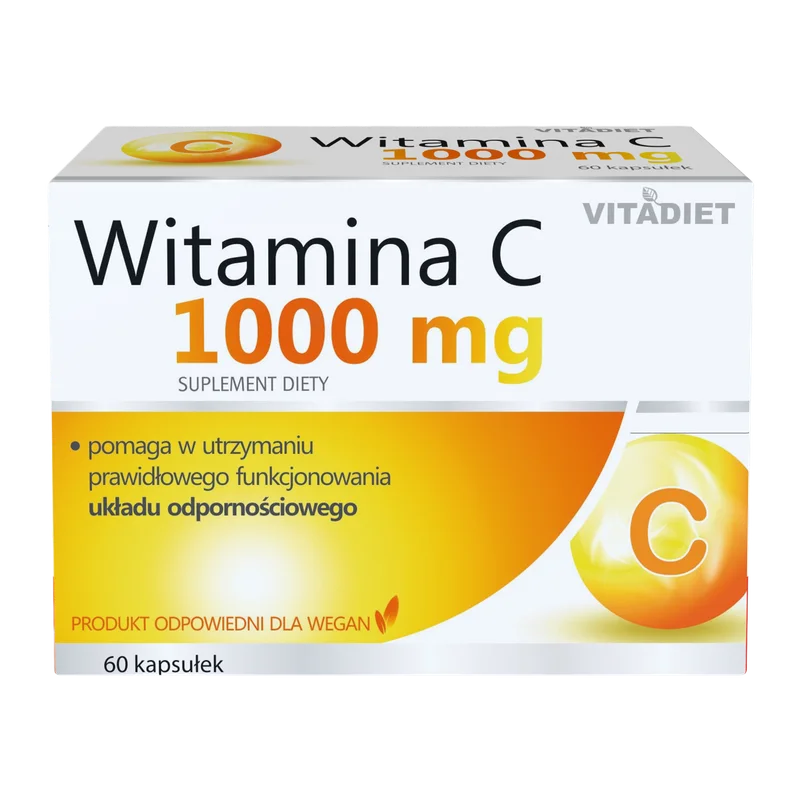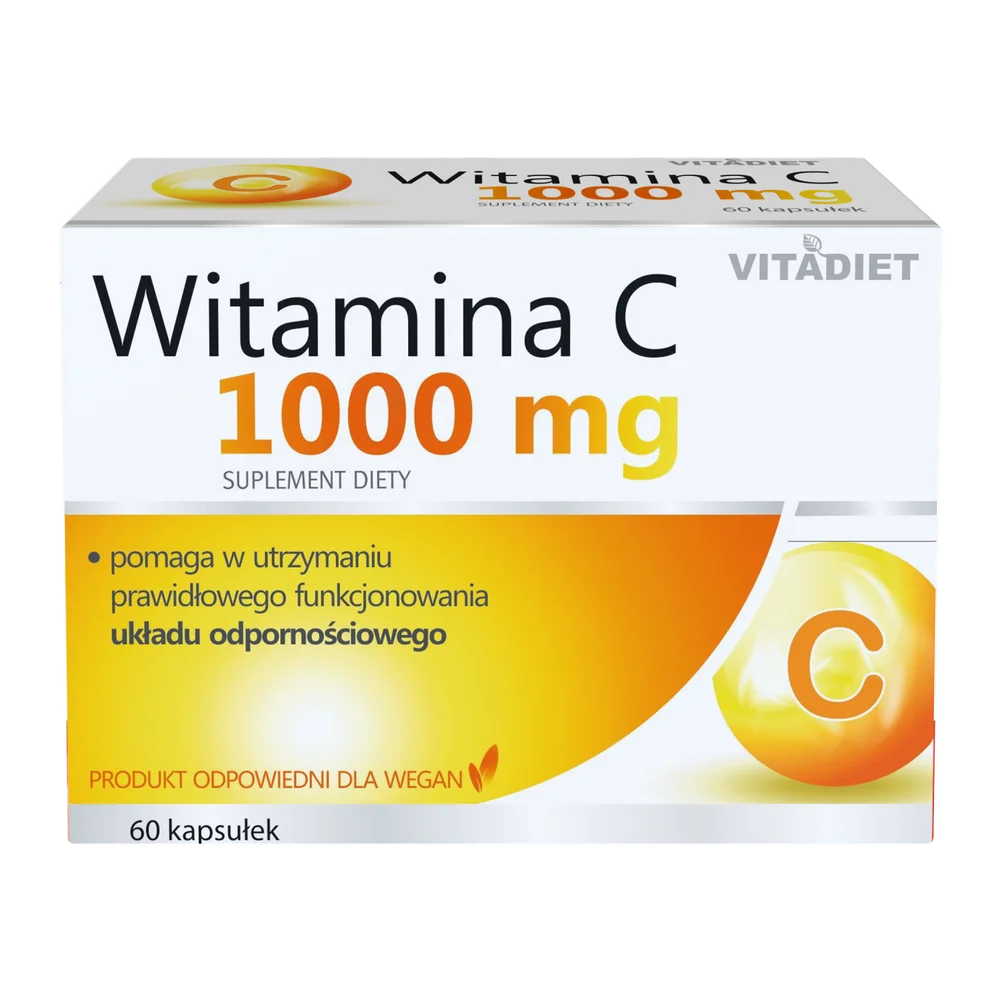 Vitadiet Witamina C 1000 mg to suplement diety dla dorosłych, zawierający w swoim składzie kwas L-askorbinowy, który wspiera prawidłowe funkcjonowanie układu odpornościowego oraz wspomagający ochronę komórek przed stresem oksydacyjnym. Produkt dla osób dorosłych.