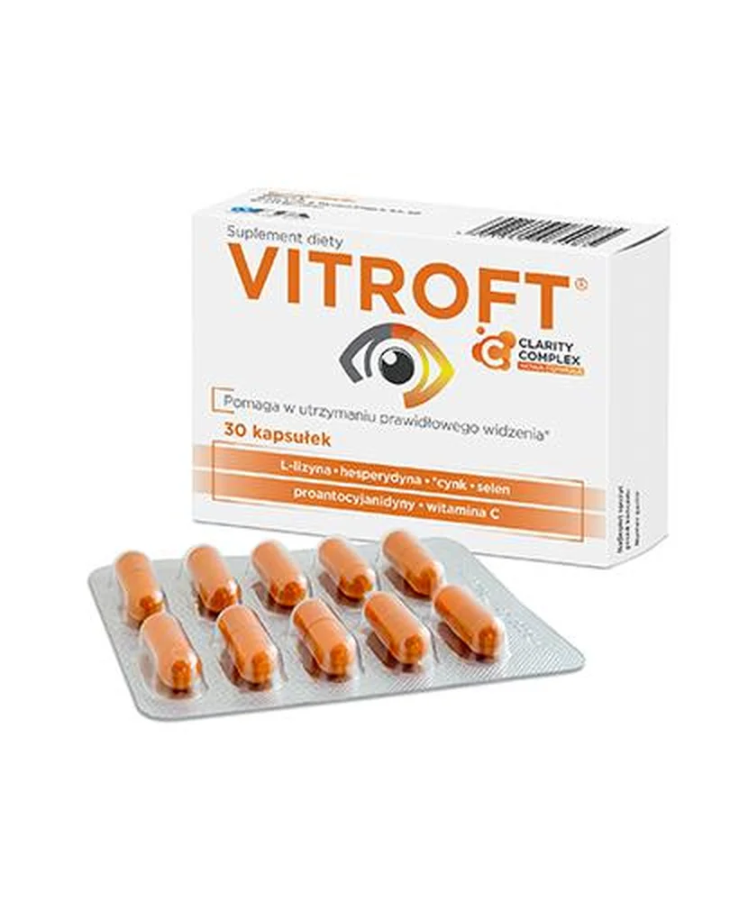 Vitroft to suplement diety zawierający kompozycję odpowiednio dobranych składników: L-lizynę, wyciąg z pestek winogron (źródło proantocyjanidyn), cynk, selen i witaminę C, składające się na formułę CLARITY COMPLEX, oraz ekstrakt z gorzkiej pomarańczy (źródło hesperydyny). Cynk pomaga w utrzymaniu prawidłowego widzenia. Witamina C pomaga w prawidłowym tworzeniu kolagenu i funkcjonowaniu naczyń krwionośnych. Wyciąg z pestek winogron (źródło proantocyjanidyn), cynk, selen oraz witamina C przyczyniają się do ochrony składników komórki przed uszkodzeniem oksydacyjnym pod wpływem wolnych rodników tlenowych.Zalecane dzienne spożycie