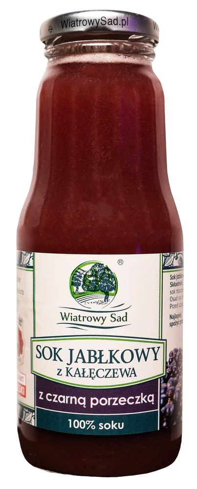 Wiatrowy Sad, Sok jabłkowy z czarną porzeczką to środek spożywczy. Produkt zawiera sok z jabłek i czarnej porzeczki. Przeznaczony do spożycia jako napój. W składzie mogą znajdować się składniki typowe dla soków owocowych, takie jak naturalnie występujące cukry. Należy przechowywać w odpowiednich warunkach, aby zapewnić jego jakość i świeżość przed spożyciem.Składniki