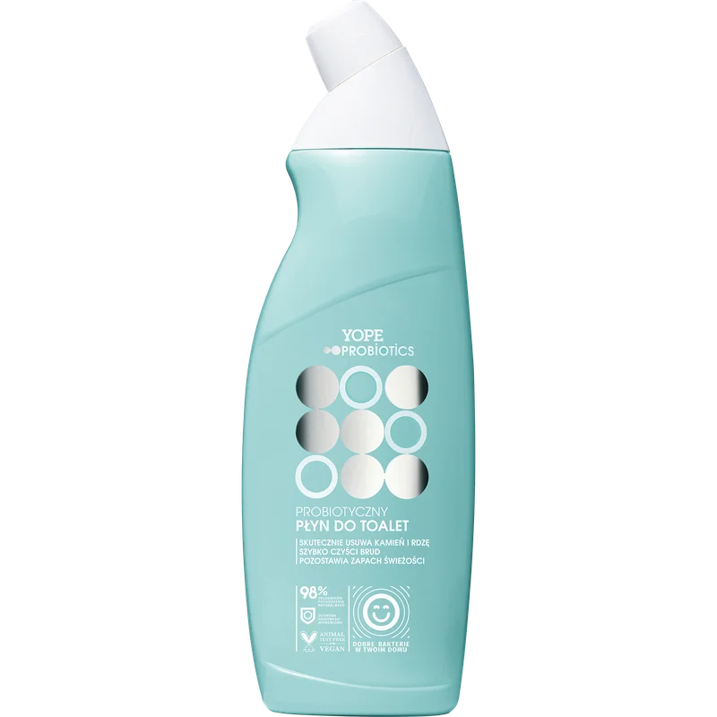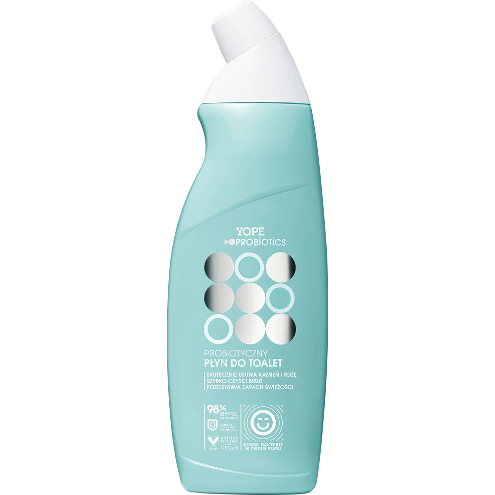 Yope Probiotics Płyn do toalet ma formułę opartą na probiotykach, które wspierają naturalną równowagę mikrobiologiczną w łazience. Produkt skutecznie usuwa zabrudzenia i osady, a także pozostawia przyjemny zapach. Może być stosowany na różnych powierzchniach toaletowych. W składzie znajdują się składniki pochodzenia roślinnego, co sprawia, że jest przyjazny dla środowiska. Po użyciu spłukuje się bezproblemowo. Produkt dedykowany do codziennego użytku.Składniki/Ingredients