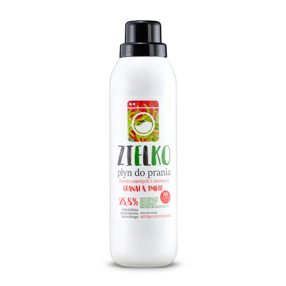 Zielko Płyn do prania tkanin czarnych i ciemnych Granat & Imbir to produkt naturalny i pachnący, skuteczny w praniu ciemnych ubrań oraz ochronie ich kolorów. Biodegradowalna formuła z 98,8% składników pochodzenia naturalnego aktywnie działa dzięki mydłu potasowemu i jest wydajna – wystarcza na 22 prania.